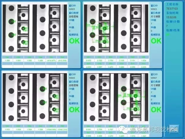 載帶缺陷檢測系統(tǒng),系統(tǒng)采用進(jìn)口工業(yè)相機(jī)快速獲取產(chǎn)品圖像,在一路相機(jī)下,實現(xiàn)兩路載帶各自定位、各自檢測。通過圖像識別、分析和計算,計算相應(yīng)位置尺寸,檢測到不良產(chǎn)品時按檢測時間命名保存不良圖像,并在顯示屏顯示當(dāng)前NG圖像,報警燈閃爍蜂鳴器輸出聲音信號。直到人工恢復(fù)報警,期間檢測不受影響。