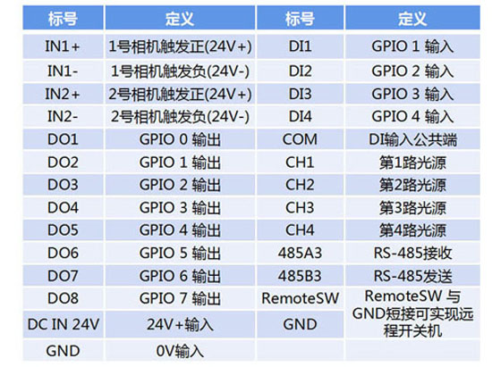 備注:3.光源使用頻閃時,IN1+、IN1-頻閃狀態下同步觸發光源CH1、CH2;IN2+、IN2-頻閃狀態下同步觸發光源CH3,CH4.